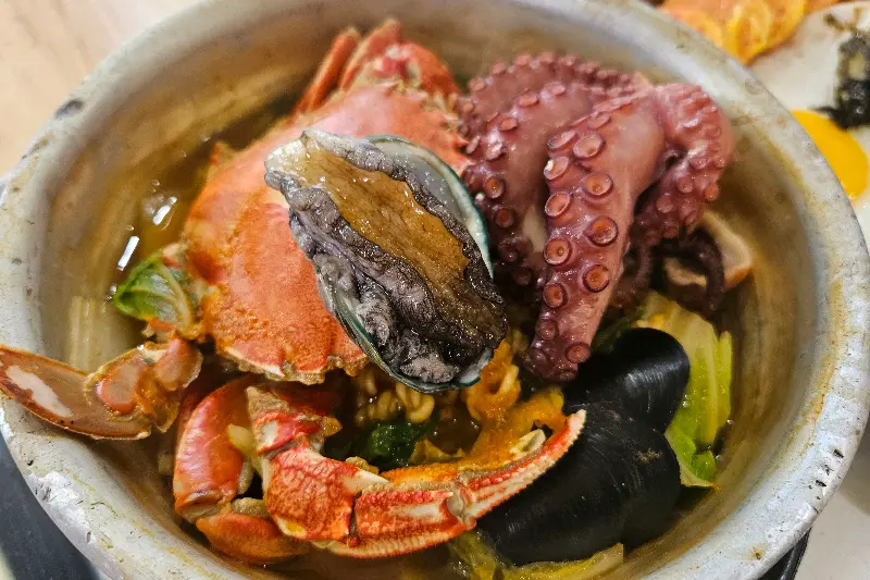 드디어 기다리고 기다리던 라면 등장! 비주얼부터가 장난 아니었어. 큼지막한 꽃게, 전복, 홍합, 새우 등등… 싱싱한 해산물이 그릇 가득 담겨 나오는데, 입이 떡 벌어지더라. 특히 문어라면은 문어 한 마리가 통째로 들어가 있어서 비주얼 쇼크! 사진을 안 찍을 수가 없었지. 인스타그램에 바로 자랑했다!
