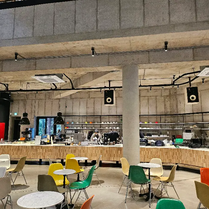 처음 여기 딱 들어서는 순간, 와… 내가 지금 카페에 온 건지, 무슨 미술관이나 갤러리에 온 건지 헷갈릴 정도였어요. 겉으로 보이는 투박한 건물과는 전혀 다른, 엄청난 개방감과 라운지 같은 분위기가 2층까지 쫙 펼쳐져 있더라고요. 높은 천장 덕분에 답답함도 전혀 없고, 콘크리트 노출 벽면이랑 무채색 인테리어에 채도 높은 컬러 의자들이 툭툭 놓여 있는 게 진짜 센스 만점이었어요. 마치 공항에 온 듯한 느낌이랄까요?