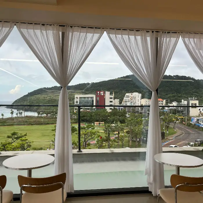 넓은 통창으로 탁 트인 바다가 시원하게 보이는데, 진짜 제주에 왔다는 실감이 확 밀려온다니까. 날씨가 흐린 날에도 그 나름대로 운치가 있지만, 해가 쨍쨍한 날 방문하면 그 빛깔이 더욱 영롱해서 마치 동남아 휴양지에 온 듯한 착각마저 불러일으켜.