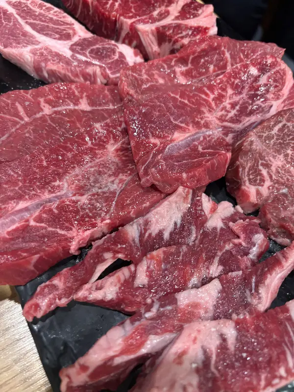 가장 대표적인 메뉴는 단연 소고기 무한리필이다. 가격은 1인당 2만원 초반대로 기억한다. (정확한 가격은 방문 전 확인하는 것이 좋다.) 이 가격에 등심, 부채살, 갈비살 등 다양한 부위의 소고기를 마음껏 즐길 수 있다는 사실이 놀라웠다. 특히, 마블링이 예술이었던 등심은 입에 넣는 순간 사르르 녹아내리는 듯했다. 을 보면 선명한 붉은색과 하얀 마블링의 조화가 신선함을 그대로 보여준다. 숯불 위에서 지글거리는 소리는 식욕을 더욱 자극했고, 육즙 가득한 풍미는 잊을 수 없는 맛의 경험을 선사했다.