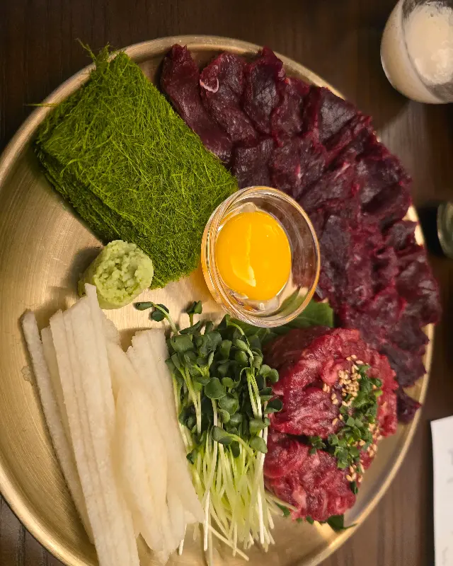 드디어 기다리고 기다리던 뭉티기가 나왔어! 비주얼부터가 장난 아니더라. 선홍색 뭉티기가 접시 위에 가지런히 놓여 있는데, 윤기가 좌르르 흐르는 게 진짜 신선해 보였어. 뭉티기와 함께 김, 얇게 채 썬 무, 쪽파, 그리고 톡 터트려 먹을 노른자까지 같이 나왔어.