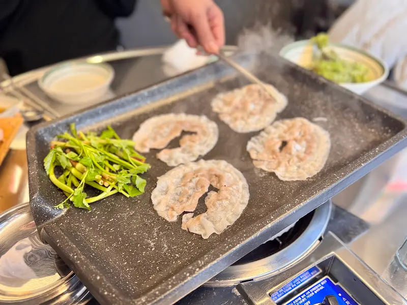 드디어 기다리고 기다리던 냉삼겹살이 등장했다. 얇게 썰린 냉삼겹살의 선홍빛 자태가 어찌나 곱던지! 마치 꽃잎이 흩날리는 듯한 비주얼에 감탄사가 절로 나왔다. 불판 위에 냉삼겹살을 올리자, 치익- 하는 소리와 함께 고소한 냄새가 코를 찔렀다. 얇은 냉삼겹살은 순식간에 노릇노릇하게 익어갔다. 기다림이 짧으니 더욱 행복하다.