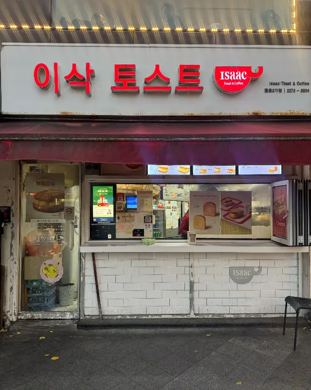 매장 밖에서 보이는 간판은 빨간색 글씨로 “이삭토스트”라고 큼지막하게 적혀 있어서 찾기 쉬웠어. 를 보면 알겠지만, 하얀색 바탕에 빨간 글씨 조합이 멀리서도 눈에 확 들어오더라구. 간판 옆에는 조그맣게 “isaac Toast & Coffee”라고 적혀 있는 걸 보니, 커피도 같이 파는 것 같았어. 을 보면 매장 안쪽이 살짝 보이는데, 키오스크에서 주문하는 사람들과 분주하게 토스트를 만드는 직원들의 모습이 보였어.