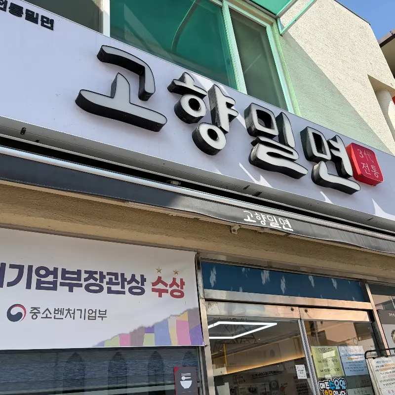 숙소에 짐 풀자마자 곧장 고향밀면으로 택시를 잡아탔다. 평일 점심시간 살짝 넘어서 도착했는데도, 역시나 웨이팅 줄이… 그래도 회전율이 빠른 편이라 그런지 생각보다 금방 자리에 앉을 수 있었다. 문을 열고 들어서는 순간, 후끈한 온기와 함께 훅 풍겨오는 육수 냄새가 진짜 미쳤다. 마치 오랜 세월 갈고 닦은 장인의 숨결이 느껴지는 듯한, 깊고 진한 향이었다.