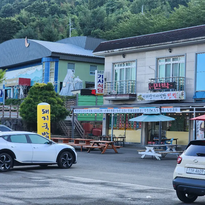 넓은 무료 공영 주차장에 차를 세우고, 드디어 ‘지리산 기사식당’ 간판이 눈에 들어왔다. 넉넉한 주차 공간은 운전 초보인 나에게도 안심을 주었다. 식당 건물은 세월의 흔적이 느껴지는 외관이었지만, 그만큼 깊은 맛과 이야기가 담겨 있을 것 같았다. 식당 앞으로는 테이블과 파라솔이 놓여 있어, 날씨 좋은 날에는 야외에서 식사를 즐길 수도 있겠다는 생각이 들었다. 푸른 하늘 아래, 지리산의 맑은 공기를 마시며 맛있는 음식을 먹는 상상만으로도 기분이 좋아졌다.