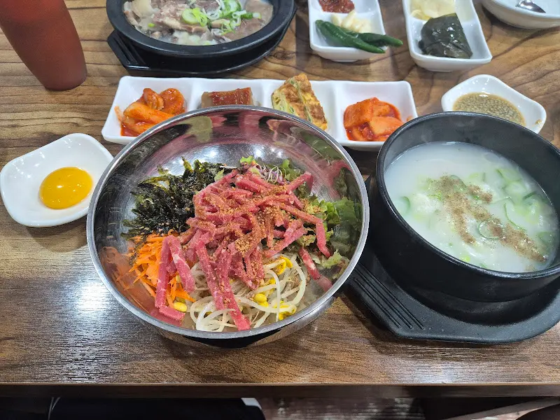 을 보면, 곰탕 외에도 다양한 반찬들이 제공되는 것을 확인할 수 있다. 특히, 짭짤하게 간이 된 무 장아찌는 밥도둑이 따로 없었다. 아삭아삭 씹히는 식감도 훌륭했고, 쿰쿰한 발효 향은 입맛을 돋우는 데 제격이었다. 또한, 매콤한 콩나물무침은 육회비빔밥의 느끼함을 잡아주는 역할을 했다. 콩나물에 함유된 아스파라긴산은 알코올 분해 효소의 활성을 촉진하여 숙취 해소에도 도움을 준다.