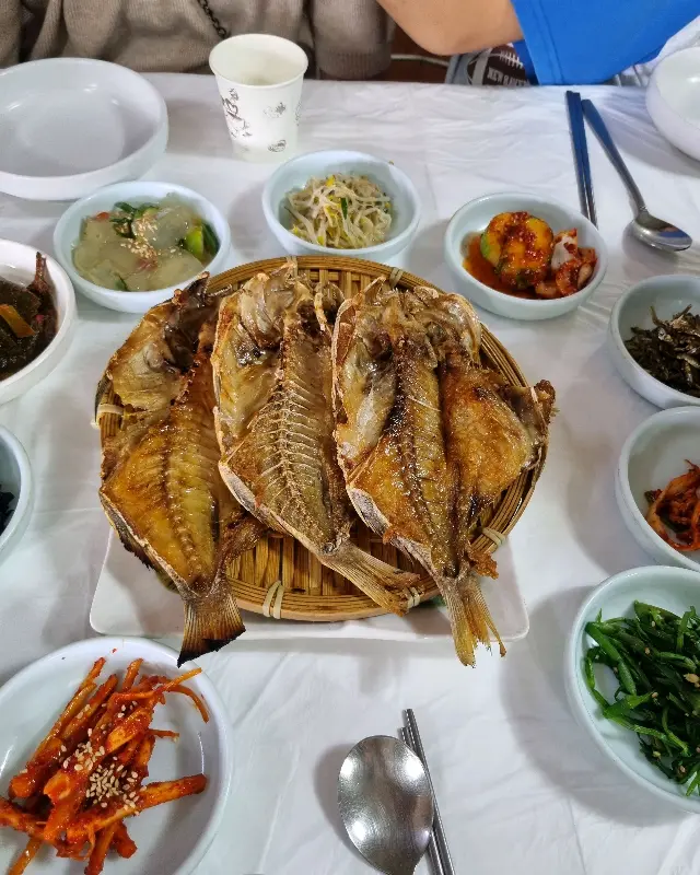드디어 기다리고 기다리던 메인 메뉴, 생선구이가 등장했다. 대나무 소쿠리에 담겨 나온 반건조 능성어는, 노릇노릇하게 구워진 모습이 정말 먹음직스러웠다. 겉은 바삭하고 속은 촉촉한 완벽한 조화는, 보는 것만으로도 행복감을 느끼게 했다. 사장님께서는 능숙한 솜씨로 생선을 손질해주셨는데, 덕분에 편하게 먹을 수 있었다.