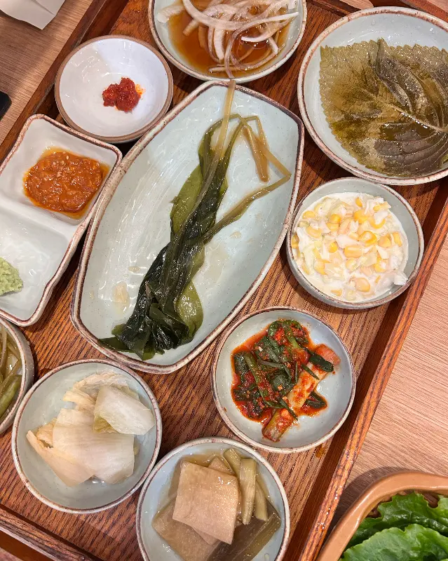 쟁반 위에 보기 좋게 담겨 나온 밑반찬들은 하나하나 정성이 가득 느껴졌다. 깻잎 장아찌, 묵은지, 갓김치, 샐러드 등 다양한 종류의 반찬들이 마치 고급 한정식집에 온 듯한 느낌을 선사했다. 특히 옥수수콘이 들어간 마요네즈 샐러드는 달콤하면서도 고소한 맛이 일품이었고, 고기가 나오기 전 입맛을 돋우기에 충분했다.