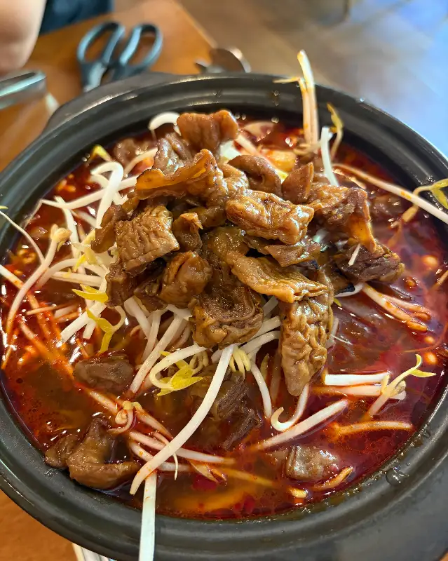 자리에 앉아 마주한 메뉴판 위로 이곳의 명성이 고스란히 묻어납니다. 가장 먼저 기대감을 안고 주문한 것은 단연 마라 곱창전골이었습니다. 냄비가 식탁에 오르자마자 퍼지는 진한 마라 향은 후각을 강렬하게 자극합니다. 정성스레 손질된 곱창은 잡내 없이 깔끔했고, 국물을 한 입 머금는 순간 밀려오는 깊고 묵직한 불맛에 절로 감탄이 새어 나왔습니다. 한국인의 입맛에 맞춰 절묘하게 변주된 마라의 얼얼함은 자극적이기만 한 것이 아니라, 식재료 본연의 맛을 품고 깊은 여운을 남깁니다.