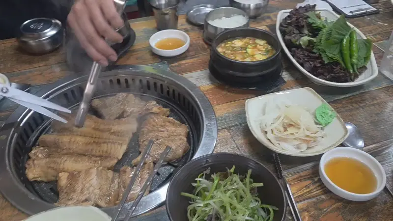 숯불 화력이 좋아서 금방 익더라. 타지 않게 자주 뒤집어주는 게 중요해. 돼지갈비는 역시 숯불에 구워야 제맛이지! 연기가 모락모락 피어오르는 모습만 봐도 군침이 싹 돌았어. 잘 익은 갈비 한 점을 집어 들고 드디어 시식!