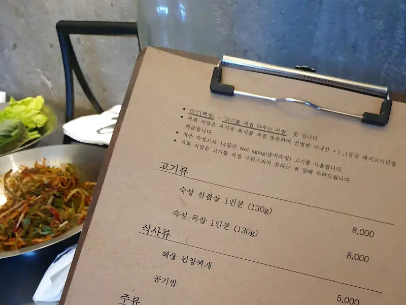 자리에 앉자마자 메뉴판을 스캔했다. 숙성 삼겹살과 목살, 그리고 해물된장찌개가 주력 메뉴인 듯했다. 나는 망설임 없이 숙성 목살과 삼겹살을 동시에 주문했다. K의 강력한 추천을 무시할 수 없었다. 잠시 후, 숯불이 들어오고, 밑반찬들이 테이블 위를 채우기 시작했다.
