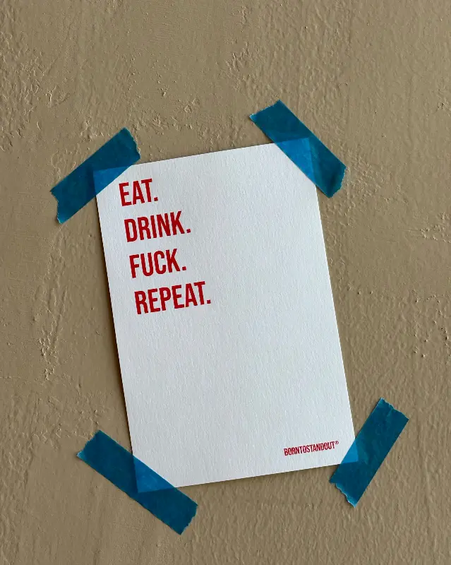 벽에 붙은 “EAT. DRINK. FXXK. REPEAT.” 문구가 적힌 포스터