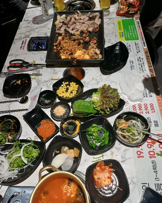 무한리필 집임에도 불구하고 고기의 퀄리티가 기대 이상이었던 점은 이곳의 가장 큰 매력 중 하나였습니다. 삼겹살뿐만 아니라 쫄깃한 식감의 오겹살, 담백한 목살까지 어느 하나 부족함 없이 훌륭했습니다. 함께 곁들여 나온 콩나물과 김치를 불판 한쪽에 함께 구워 먹으니, 기름진 고기의 맛을 잡아주는 동시에 풍성한 식감을 더해주었습니다.