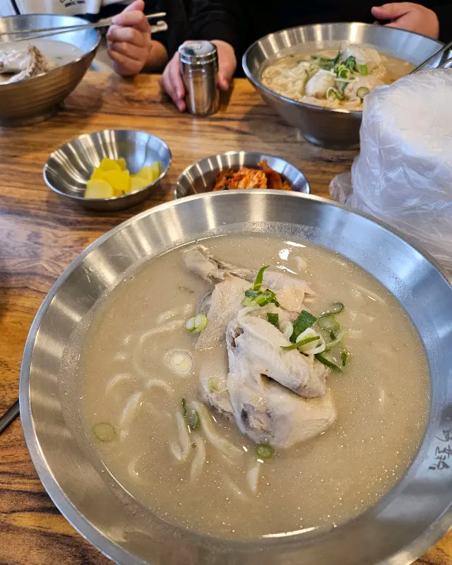 드디어 기다리고 기다리던 닭칼국수가 나왔다. 스테인리스 그릇에 담겨 나온 닭칼국수는 푸짐한 양에 압도되었다. 뜨거운 김이 모락모락 피어오르는 뽀얀 국물 위에는 큼지막한 닭고기가 얹어져 있었다. 송송 썰린 파와 김 가루가 고명으로 올라가, 먹음직스러운 비주얼을 완성했다.