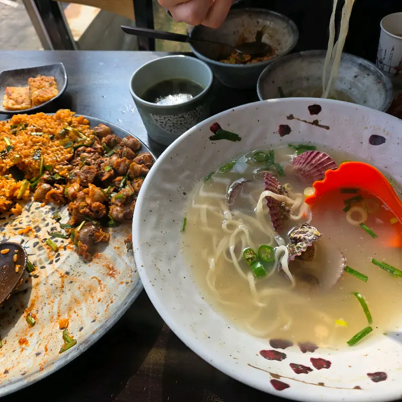 먹다 보니 뜨끈한 국물이 땡겨서 해물칼국수도 추가로 주문했다. 참고) 해물이 듬뿍 들어간 칼국수라니… 이것도 비주얼부터 장난 아니었다. 칼국수 면도 쫄깃쫄깃하고, 국물은 진짜 시원하고 깊은 맛이 났다. 해물 덕분에 국물이 더 깔끔하고 시원한 느낌! 특히 추운 날씨에 뜨끈한 칼국수 국물 마시니까 몸이 사르르 녹는 것 같았다. 칼국수 안 시켰으면 진짜 후회할 뻔했다.