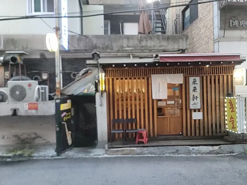 가게 앞에 다다르자, 사진으로 보던 것보다 훨씬 더 강렬한 첫인상이 나를 맞이했다. 나무 격자 프레임으로 둘러싸인 외관은 일본 특유의 소박하면서도 따뜻한 분위기를 자아냈다. 특히 낡은 나무 문에 걸린 흰 천 간판에는 정갈한 글씨체로 ‘라이라이켄’이라고 적혀 있어, 마치 시간이 멈춘 듯한 착각을 불러일으켰다. 가게 앞에는 놓인 낡은 의자와 작은 테이블은 잠시 쉬어가라는 듯 정겨운 느낌을 더했다.