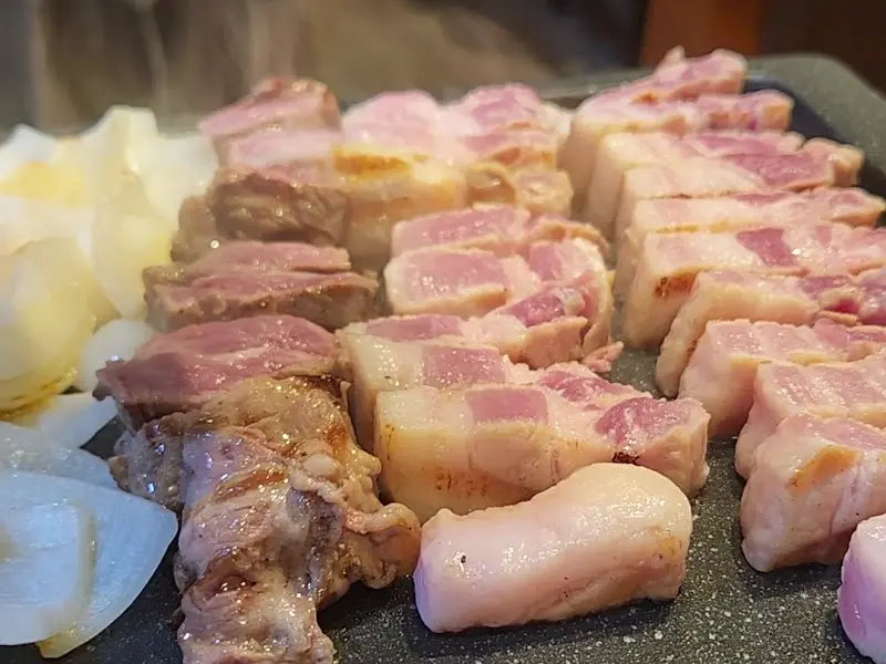 드디어 기다리고 기다리던 모둠 한판이 등장했다. 숯불에서 초벌구이 되어 나온 고기는, 보기만 해도 육즙이 가득해 보였다. 직원분들은 능숙한 솜씨로 고기를 불판 위에 올려주셨다. 지글지글 익어가는 고기 소리는 우리의 침샘을 자극했고, 우리는 젓가락을 들고 고기가 익기만을 기다렸다.