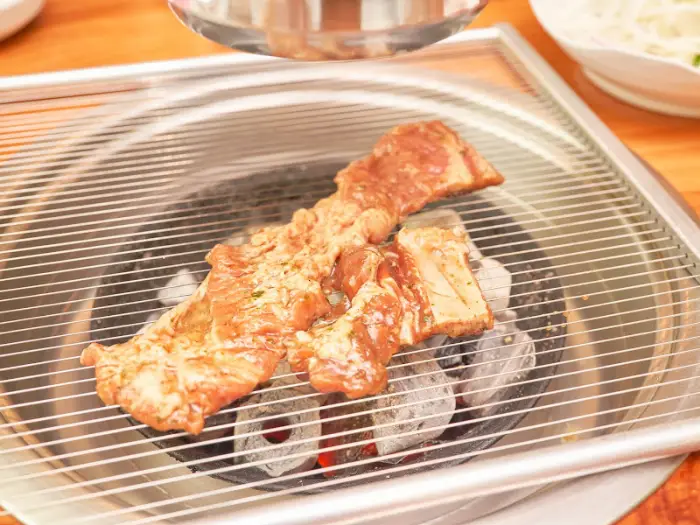 드디어 기다리고 기다리던 고기가 불 위에 올라갔다. 숯불의 은은한 열기가 돼지갈비의 육즙을 가두며 풍미를 더해주는 듯했다. 고추냉이로 양념했다는 말이 믿기지 않을 정도로, 고기 자체의 부드러움과 양념의 적당한 단맛이 조화롭게 어우러졌다. 일반적인 양념갈비는 때로는 너무 달아서 부담스러울 때도 있는데, 이곳의 갈비는 그런 걱정이 없었다. 지역 특산물인 고추냉이 잎을 사용했다는 점이 이 집만의 특별함을 더하는 것 같았다.