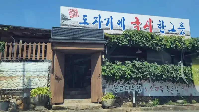 드디어 찾아냈다! 오늘 소개할 곳은 경북 청도, 나만 알고 싶은 그런 맛집이다. 꼬불꼬불 시골길을 따라 들어가다 보면 마치 시간이 멈춘 듯한 공간이 나타나는데, 바로 ‘도자기에 칼국수 한 그릇’이라는 정감 넘치는 이름을 가진 식당이다. 간판부터가 예사롭지 않다. ‘도자기에 칼국수 한 그릇’이라는 글씨가 큼지막하게 쓰여 있고, 그 위에 얹어진 기와 그림이 왠지 모르게 마음을 푸근하게 만들어준다.