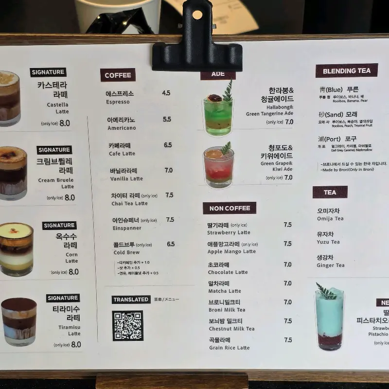 메뉴판을 펼쳐보니, 시그니처 라떼부터 블렌딩 티, 에이드까지 다채로운 음료와 디저트들이 가득했다. 특히 눈에 띄는 건 브륄레, 티라미수, 옥수수 라떼처럼 개성 넘치는 시그니처 메뉴들이었다. 고민 끝에, 이곳의 대표 메뉴라는 ‘크림 브륄레 라떼’와 ‘황치즈 바스크 케이크’를 주문했다.