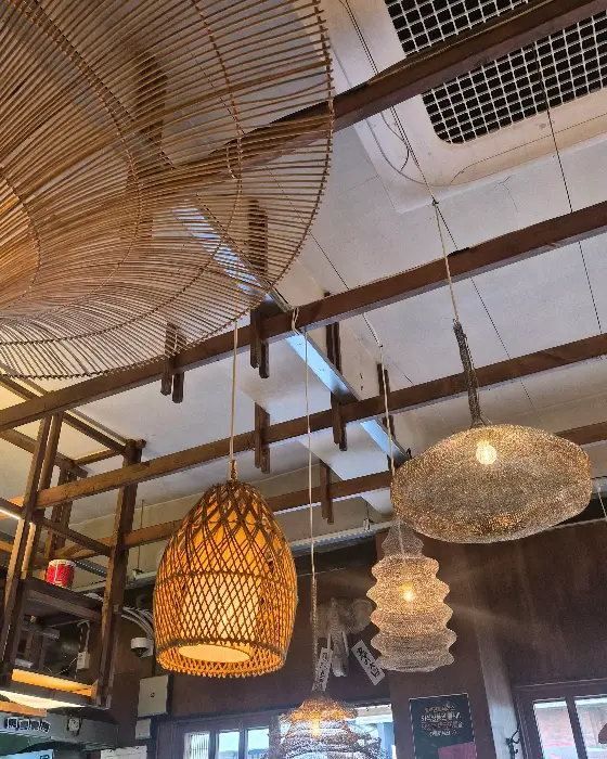 식당 안으로 들어서는 순간, 감각적인 인테리어에 시선이 멎었다. 톤 다운된 나무 재질과 곳곳에 배치된 이국적인 소품들이 조화롭게 어우러져 편안하면서도 특별한 분위기를 자아냈다. 마치 동남아시아의 어느 작은 마을에 온 듯한 착각을 불러일으키는 섬세한 조명과 소품들은 단순히 공간을 채우는 것을 넘어, 이곳에서의 식사가 단순한 끼니를 넘어선 하나의 경험이 될 것임을 예감하게 했다. 천장을 장식한 독특한 디자인의 등불들은 마치 예술 작품처럼 느껴졌고, 은은하게 퍼지는 불빛은 공간 전체에 따뜻하고 아늑한 온기를 더했다. 특히, 천장에 매달린 커다란 대나무 소재의 갓등과 그 아래로 늘어진 여러 모양의 바구니 형태 조명들은 마치 태국의 어느 시장을 연상케 하며, 이국적인 분위기를 한껏 고조시켰다.