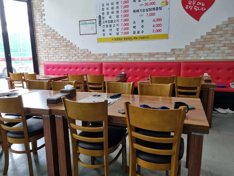식당 앞에 다다르니, 넓은 주차 공간이 가장 먼저 눈에 들어왔다. 마치 고향집에 온 듯한 편안함이 느껴지는 외관이었다. 문을 열고 들어서자, 넓고 깔끔한 홀이 펼쳐졌다. 테이블 간 간격도 넉넉해서 편안하게 식사를 즐길 수 있을 것 같았다. 벽돌 모양의 벽면과 붉은색 의자가 인상적인 포인트였다.