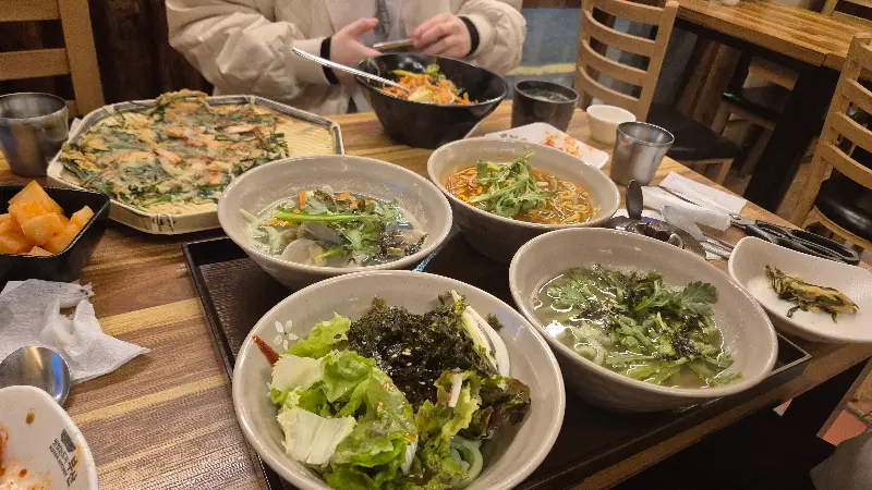 칼국수와 함께 곁들여 먹기 위해 파전도 주문했습니다. 빈틈없이 꽉 채워진 오징어가 인상적인 파전은 겉은 바삭하고 속은 촉촉했습니다. 특히 간장에 살짝 찍어 먹으니, 짭짤하면서도 고소한 맛이 일품이었습니다. 파전의 풍성한 식감은 칼국수의 부드러움과 대비되어 더욱 만족스러운 식사를 완성시켜주었습니다.