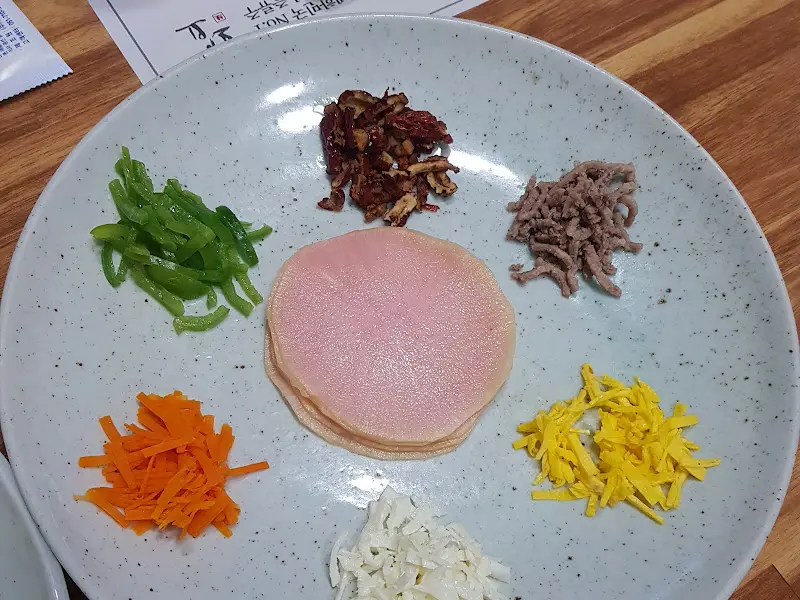 곧이어 칠절판이 나왔는데, 흰색/노란색 계란 지단, 파프리카, 대추, 버섯, 당근 등 6가지 재료의 색감이 진짜 예술이었어. 쌈무에 싸서 먹으니 아삭아삭 신선함이 입안 가득 퍼지는 거 있지! 쌈무가 조금 작아서 재료를 많이 넣으면 싸기가 조금 힘들었지만, 맛은 진짜 최고였어.