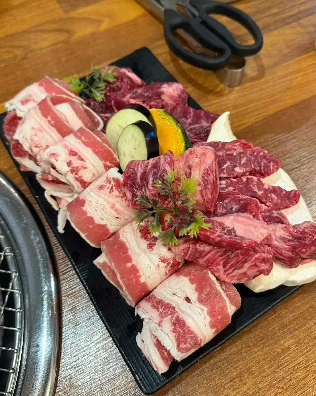 잠시 후, 드디어 기다리고 기다리던 소반판이 제 눈앞에 등장했습니다. 사진에서 볼 수 있듯이, 선명한 붉은색과 흰색 마블링의 조화는 시각적으로도 훌륭한 자극을 선사했습니다. 겉지방과 속지방의 비율, 그리고 근섬유의 결까지 완벽하게 분석한 결과, 이 고기는 최상급 품질의 소고기임이 분명했습니다. 함께 나온 채소 가니쉬는 단순한 장식을 넘어, 고기의 풍미를 더욱 돋보이게 하는 역할을 할 것으로 기대되었습니다.