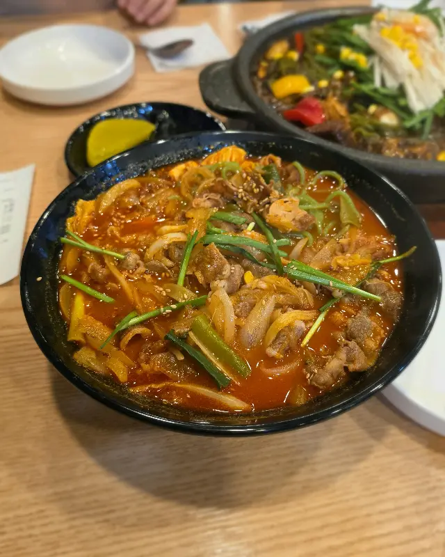 가장 먼저 등장한 것은 ‘문어 돌짜장’이었습니다. 뜨겁게 달궈진 돌판 위에서 짜장 소스가 지글거리는 소리는 청각을 자극했고, 코를 찌르는 매콤한 향은 후각을 마비시킬 정도였습니다. 시각적인 아름다움 또한 빼놓을 수 없었죠. 윤기가 흐르는 짜장 소스 위로 통통한 문어 한 마리가 통째로 올라가 있었고, 그 주변을 알록달록한 채소들이 수놓고 있었습니다. 사진에서 보듯 붉은색 파프리카, 노란색 옥수수, 초록색 부추가 색의 3원색을 이루며 식욕을 자극했습니다.