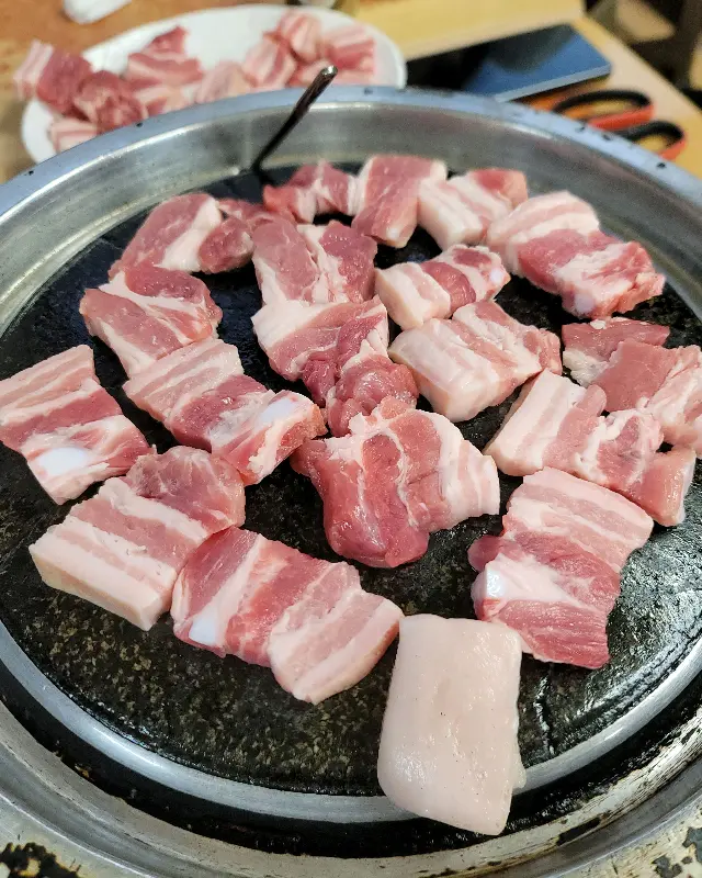 메뉴판은 단출했다. 오로지 생삼겹살 하나. 이 단순함에서 느껴지는 자신감이 마음에 들었다. 고기 질에 대한 자부심이 없다면, 이렇게 하나의 메뉴로 승부를 걸 수 없을 것이다. 곧이어, 큼지막하게 썰린 생삼겹살 한 접시가 눈앞에 놓였다. 선홍빛 살코기와 눈처럼 하얀 비계가 조화롭게 어우러진 모습은, 신선함 그 자체였다. 마치 정육점에서 바로 썰어 온 듯한 두툼한 두께는 시각적인 만족감까지 더했다.