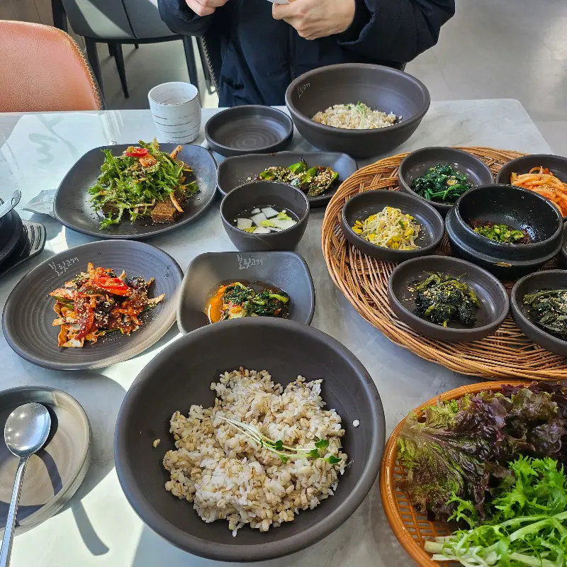 주문을 마치자, 직원분께서 따뜻한 물수건과 함께 숭늉을 내어주셨다. 숭늉의 은은한 단맛이 긴장감을 풀어주며 식사를 기다리는 시간을 더욱 설레게 만들었다. 곧이어, 테이블 위로 정갈하게 담긴 음식들이 하나둘씩 놓이기 시작했다. 형형색색의 나물들이 마치 꽃처럼 테이블을 가득 채웠다. 콩나물, 무생채, 시금치, 고사리, 취나물… 하나하나 정성스럽게 무쳐진 나물들은 보기만 해도 건강해지는 기분이었다.