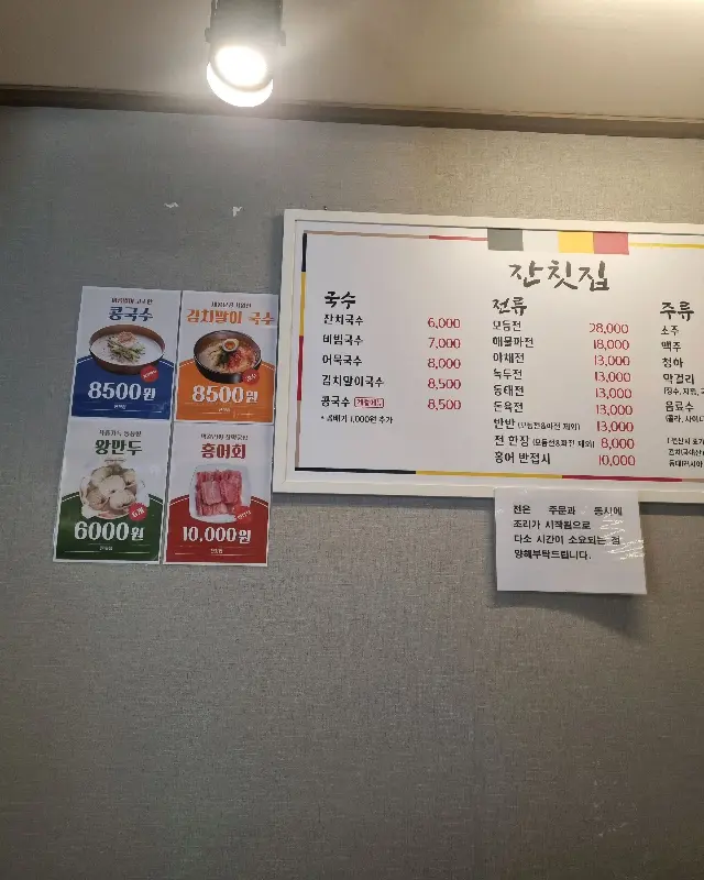 자리에 앉아 메뉴판을 훑어봅니다. 잔치국수, 비빔국수, 파전, 녹두전 등 소박하지만 정감 있는 메뉴들이 눈에 들어옵니다. 고민 끝에 저는 이 집의 대표 메뉴인 잔치국수와, 왠지 모르게 끌리는 녹두전을 주문했습니다. 벽에 붙은 메뉴 사진들을 보니 더욱 기대감이 커집니다.