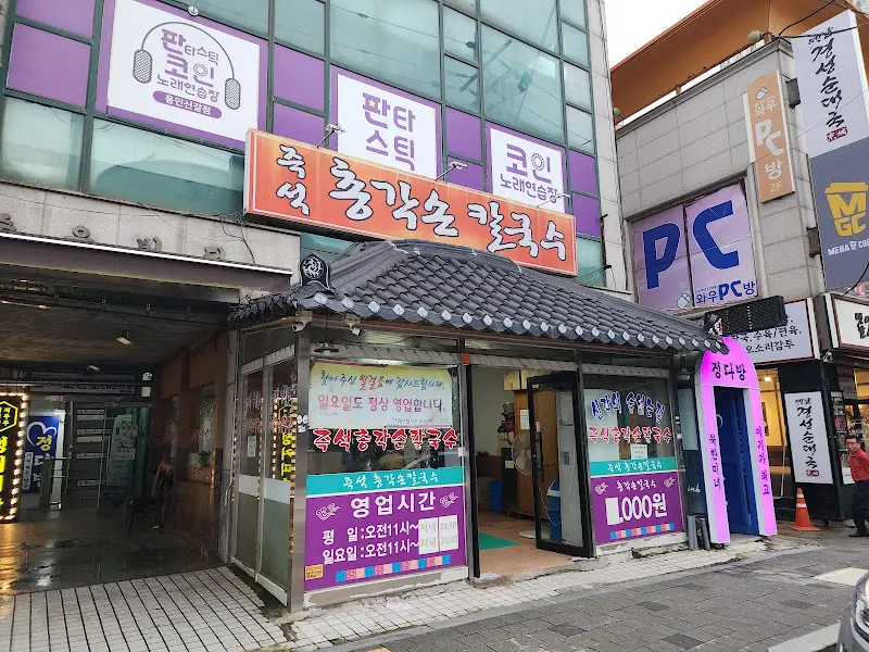 오후 4시 30분, 해가 뉘엿뉘엿 기울어가는 시간. 식당 앞에 도착했을 때, 예상외로 많은 사람들로 북적였다. 웨이팅이 없어 다행이었지만, 거의 만석에 가까운 모습이었다. 식당 입구, 세월의 흔적이 느껴지는 간판이 오랜 역사를 말해주는 듯했다. 붉은색 바탕에 큼지막하게 쓰인 ‘총각손칼국수’라는 글자가 눈에 확 들어왔다. 간판 옆으로는 코인 노래방 간판이 함께 붙어 있어 독특한 분위기를 자아냈다. 마치 시간이 멈춘 듯한 풍경 속에서, 나는 묘한 기대감을 느꼈다.