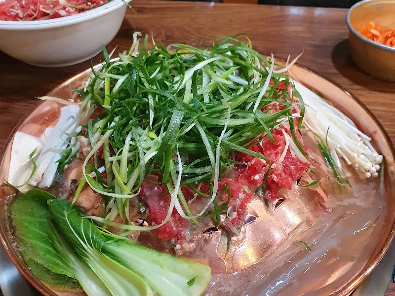 불판 위에 불고기를 올리자, 지글거리는 소리와 함께 달콤한 향이 코를 자극했다. 육수가 투명한 듯 맑았는데, 파불고기와 어우러지면서 깊은 맛을 낼 것 같은 기대감이 들었다. 불고기가 익어가는 동안, 나는 무생채와 김치를 맛보았다. 신선한 재료에서 느껴지는 아삭한 식감과, 적당히 매콤하면서도 달콤한 양념의 조화가 훌륭했다.