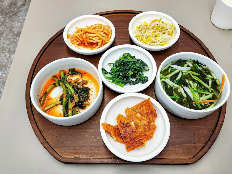잠시 후, 과학 실험의 정밀함을 연상시키는 정갈한 밑반찬들이 나무 쟁반 위에 올려져 나왔다. 윤기가 흐르는 열무김치, 고소한 냄새가 코를 자극하는 콩나물 무침, 매콤한 무생채, 신선한 샐러드, 그리고 따뜻하게 구워진 두부 부침까지, 하나하나가 훌륭한 조연 역할을 해낼 준비가 되어 있었다. 특히 붉은 양념에 버무려진 열무김치는 젖산 발효를 통해 생성된 유기산 덕분에 입맛을 돋우는 데 탁월했다. 마치 촉매제가 화학 반응을 활성화시키듯이, 열무김치는 나의 식욕을 폭발 직전까지 끌어올렸다.