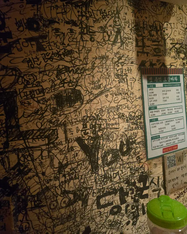 문을 열고 들어서는 순간, 왁자지껄한 웃음소리와 맛있는 냄새가 후각과 청각을 동시에 자극하며 어린 시절 추억을 소환하는 듯했어요. 벽 한쪽에는 손님들이 빼곡하게 써놓은 낙서들이 가득했는데, 마치 타임캡슐을 열어보는 듯한 기분이 들었답니다. 정겨운 분위기에 흠뻑 취해 자리를 잡고 앉으니, 마치 오랜 친구 집에 놀러 온 듯 편안했어요. 테이블은 정겨운 양은 재질로 되어있고, 빨간색 테이블보가 덮여져 있어 왠지 모르게 마음이 따뜻해졌습니다.