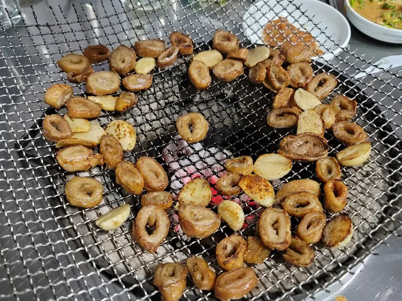 숯불 위에서 막창과 마늘이 함께 구워지는 모습