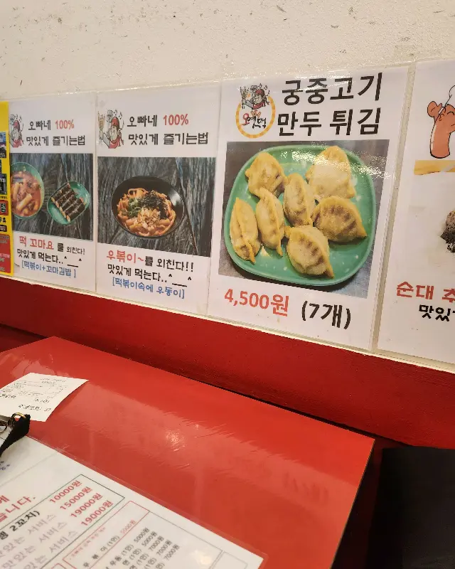 메뉴판을 펼쳐 들었다. 떡볶이, 김밥, 튀김, 순대 등 다양한 메뉴들이 있었다. 떡볶이는 옛날 떡볶이와 국물 떡볶이 두 종류가 있었는데, 나는 달짝지근한 국물떡볶이를 먹고 싶어서 국물 떡볶이 1인분을 주문했다. 튀김도 빠질 수 없지! 김말이와 야끼만두를 추가했다. 혼자 왔지만, 이 정도는 거뜬하다. 메뉴판에는 세트 메뉴도 있었는데, 2인 세트 구성이 꽤 알차 보였다. 다음에는 친구와 함께 와서 세트 메뉴를 시켜봐야겠다.