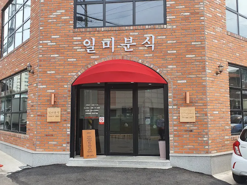 벽돌로 지어진 건물 외관에 큼지막하게 박힌 “일미분식” 네 글자가 왠지 모르게 정겹게 느껴졌어. 빨간색 어닝이 씌워진 통유리 문을 열고 들어가니, 깔끔하면서도 정돈된 내부가 눈에 들어왔어. 예전엔 허름한 시장 쪽에 있었다고 하는데, 리모델링을 싹 해서 완전 깔끔해졌더라.