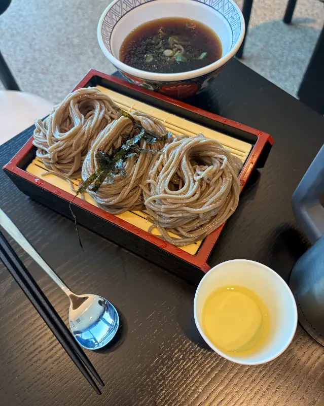 잠시 후, 정갈하게 차려진 음식들이 테이블 위에 놓였다. 을 보면, 소바는 나무 받침 위에 가지런히 놓여 있었고, 쯔유와 파, 와사비가 함께 제공되었다. 돈까스는 겉은 바삭하고 속은 촉촉해 보였고, 유부초밥은 큼지막한 크기를 자랑하며 먹음직스러운 자태를 뽐냈다. 음식 하나하나에 정성이 느껴지는 듯했다.