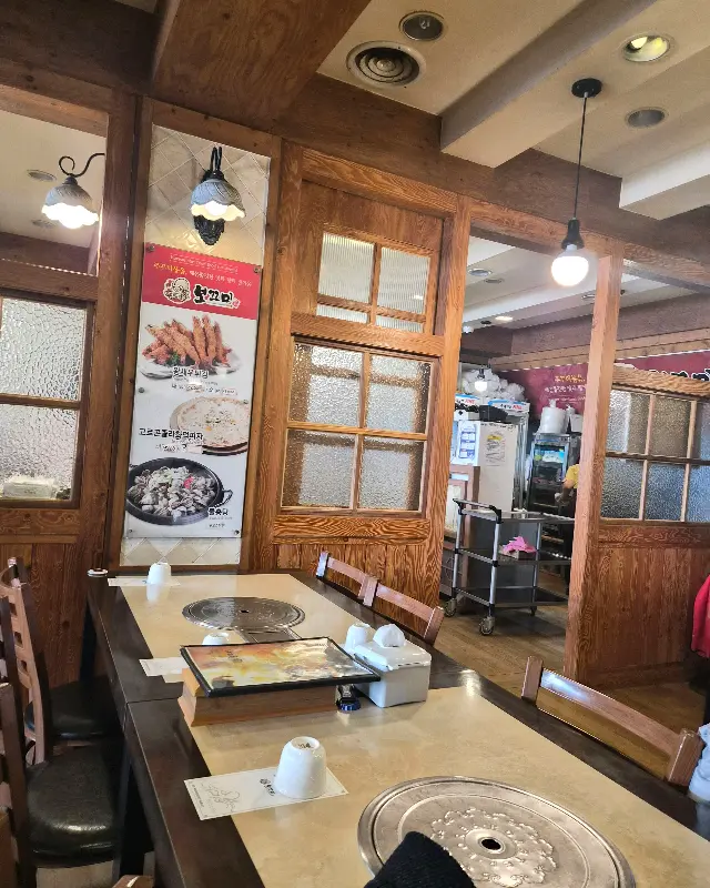 문을 열자마자 후끈한 열기가 나를 반기네. 나무 테이블 쫙 깔린 인테리어, 정감 넘치는 분위기가 마치 고향집에 온 듯 푸근해.