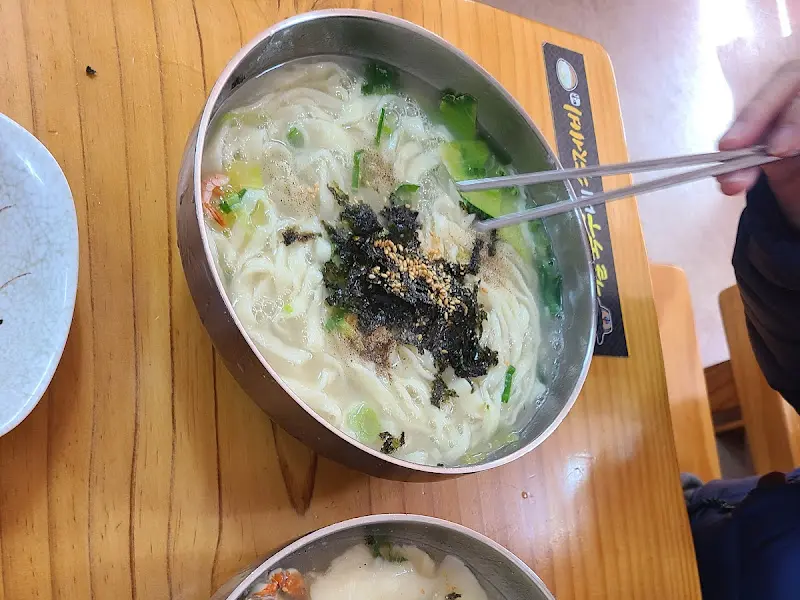 이곳의 손칼국수는 직접 반죽하고 숙성시킨 면발이 핵심입니다. 면을 한 입 가득 넣고 씹을 때마다 느껴지는 쫄깃함은 기계면에서는 절대 느낄 수 없는 매력이죠. 육수는 멸치와 다시마를 기본으로 한 해물 육수인데, 시원하면서도 깊은 맛이 일품입니다. 간혹 후추 향이 강하다는 의견도 있지만, 제 입맛에는 딱 좋았어요. 칼국수 위에는 김 가루와 깨가 듬뿍 뿌려져 있어 고소한 풍미를 더합니다. 가격은 8,000원으로, 푸짐한 양을 고려하면 가성비도 훌륭하다고 생각합니다. 특히 비 오는 날, 창밖을 바라보며 뜨끈한 칼국수 한 그릇을 먹으면 세상 시름이 싹 잊히는 기분이에요. 사진에서 보이는 것처럼 스테인리스 그릇에 담겨 나오는데, 뜨거운 국물이 오랫동안 식지 않아 더욱 좋았습니다.