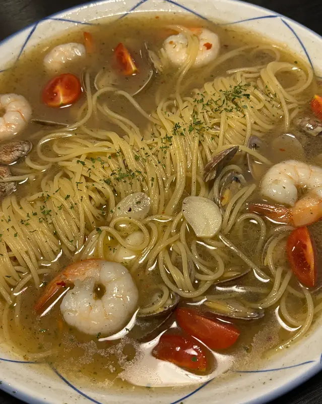 가장 먼저 나온 것은 바지락술찜 파스타였다. 김이 모락모락 피어오르는 접시 안에는 탱글탱글한 새우와 바지락, 토마토가 넉넉하게 담겨 있었다. 국물 한 입을 맛보는 순간, 입 안 가득 퍼지는 시원하면서도 얼큰한 맛에 감탄했다. 짭짤한 바다의 향과 매콤한 고추의 조화가 환상적이었다. 면발은 적당히 익어 쫄깃했고, 바지락과 새우는 신선함이 느껴졌다.