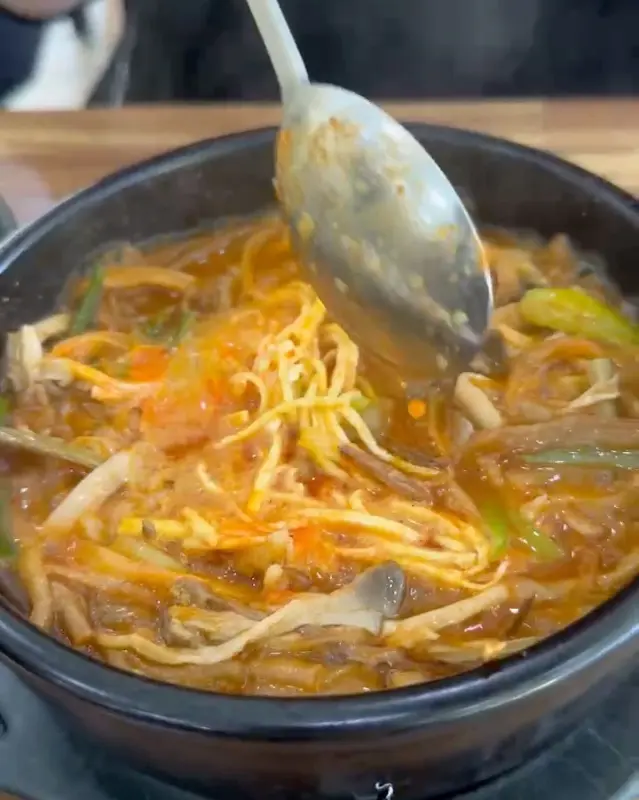 주문하고 얼마 지나지 않아, 드디어 그 녀석이 모습을 드러냈어. 뚝배기에 담긴 육개장이 보글보글 끓는 모습이 진짜 예술이더라. 뜨거운 김이 확 올라오는데, 캬… 이 냄새, 이 비주얼! 사진으로 봤던 것보다 훨씬 먹음직스러웠어.