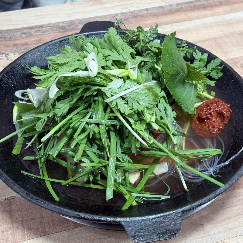 냄비 안에는 닭고기와 함께, 각종 채소와 면사리가 가득 담겨 있었다. 특히,에서 보이는 것처럼, 쑥갓, 미나리, 깻잎 등 신선한 채소가 푸짐하게 올려져 있는 모습이 인상적이었다. 붉은 양념장 아래 숨겨진 닭갈비의 자태가 어서 빨리 맛보고 싶게 만들었다. 면사리 종류도 다양해서 취향에 따라 골라 먹을 수 있다는 점이 매력적이다. 나는 쫄깃한 쫄면 사리를 선택했다.