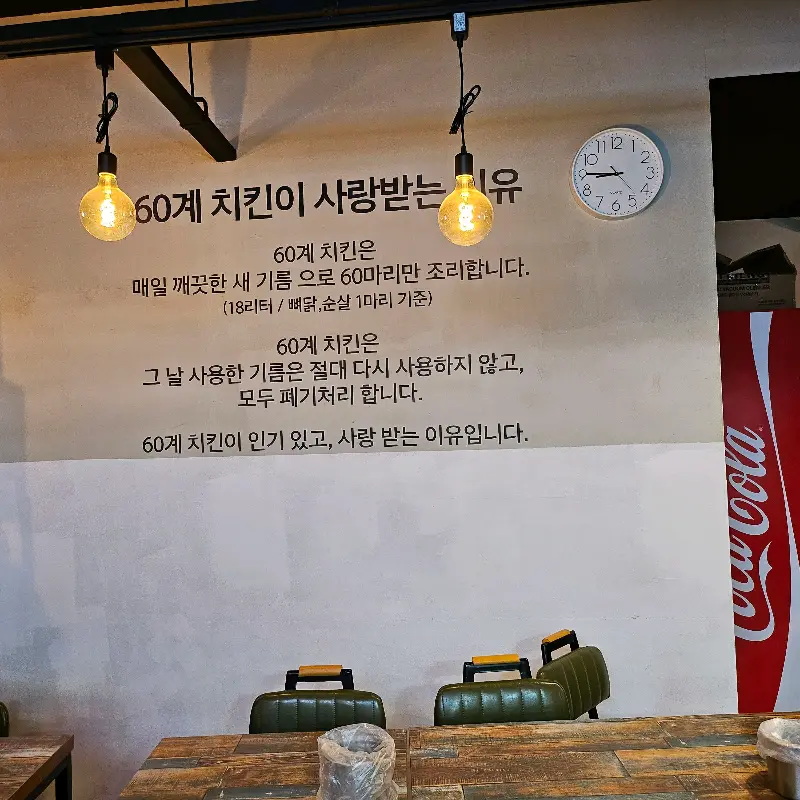 매장에 들어서자마자 딱 느껴지는 깔끔함! 솔직히 치킨집 위생 상태 별로인 곳들도 많은데, 여기는 테이블이며 바닥이며 진짜 깨끗하더라. 를 보면 알겠지만, 테이블 간 간격도 넓어서 편안하게 먹을 수 있는 분위기였어. 벽에 붙은 “60계 치킨이 사랑받는 이유” 문구가 눈에 띄었는데, 매일 새 기름으로 60마리만 튀긴다는 내용이었어. 왠지 믿음이 팍팍 가는 거 있지?