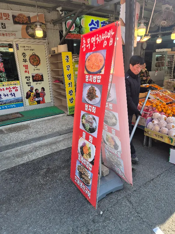 통영에 도착하자마자 나는 망설임 없이 중앙시장으로 향했다. 활기 넘치는 시장 풍경은 언제나 나를 들뜨게 한다. 왁자지껄한 상인들의 목소리, 싱싱한 해산물이 가득한 수족관, 형형색색의 과일과 채소들이 눈과 귀를 사로잡았다. 그 사이를 헤집고 다니다 보니, 드디어 오늘의 목적지인 “충무멸치쌈밥” 간판이 눈에 들어왔다.