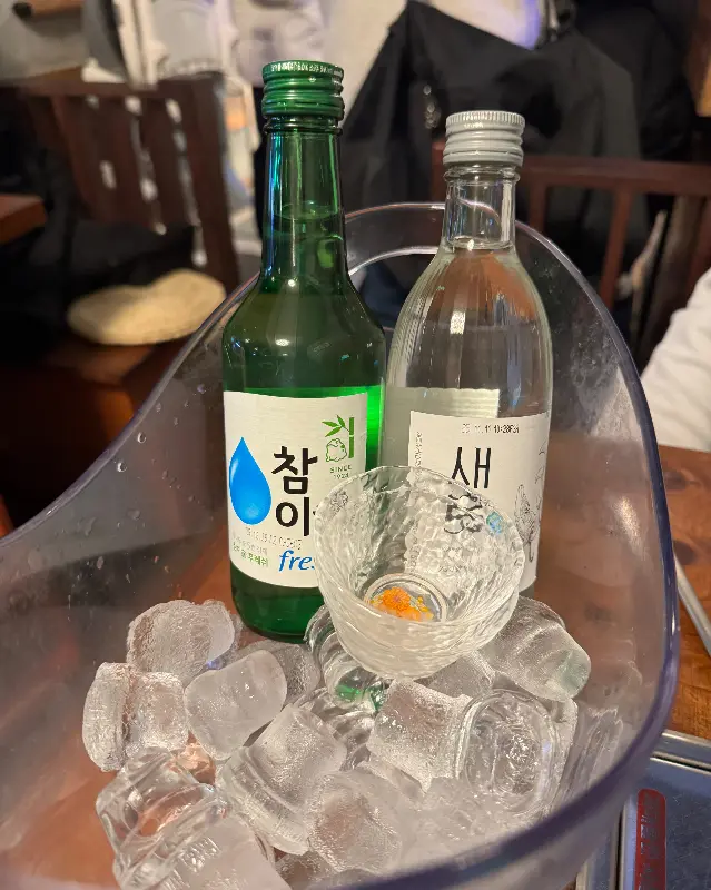 잠시 후, 시원한 술이 먼저 나왔다. 얼음 바스켓에 담겨 나온 소주병은 보기만 해도 더위가 싹 가시는 기분이었다. 잔에 술을 따르고 첫 모금을 마시니, 쌉쌀하면서도 청량한 맛이 입안 가득 퍼졌다. 역시, 맛있는 음식에는 술이 빠질 수 없지.