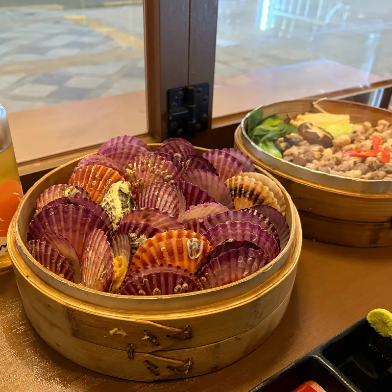 가장 먼저 등장한 메뉴는 굄의 시그니처 메뉴인 가리비찜이었다. 찜통 가득 담긴 가리비의 모습은 그야말로 압도적이었다. 뚜껑을 여는 순간, 김이 모락모락 피어오르며 싱싱한 해산물 향이 코를 찔렀다. 뽀얀 속살을 드러낸 가리비는 탱글탱글함이 살아있었다. 젓가락으로 조심스럽게 가리비 하나를 집어 들었다. 껍데기에서 쉽게 분리되는 걸 보니 신선도는 의심할 여지가 없었다.